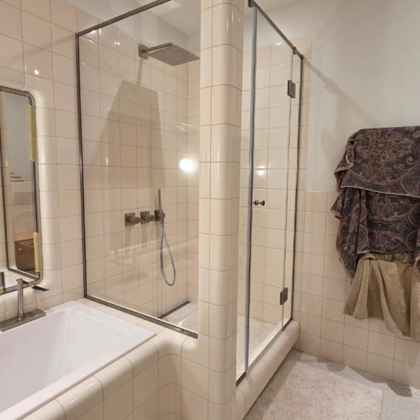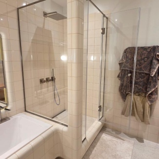 Предоставляем заказчикам отличный уровень работы и отменный исход сделки. Несколько причин, из-за чего и в нашу компанию приходят для производства таких проектов как Распашная душевая перегородка из стекла - Мичуринская ул.: