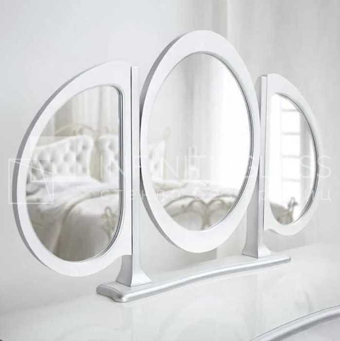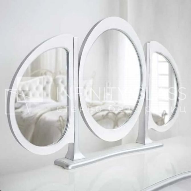 Наша организация Infinity Glass выполнила интересный образец продукции — зеркало трехстворчатое настольное. Требуемые этапы по части заказа выполнены оперативно, изделие подготовлено на нашем цехе. Что было сделано: