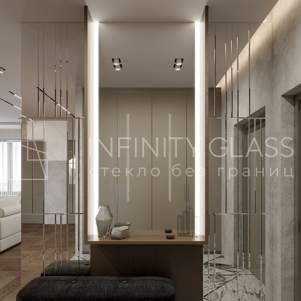 Фирма «Инфинити Гласс» передала заказчику очередной проект — зеркальное панно с подсветкой в прихожую. Необходимые этапы в рамках задачи подготовлены без промедлений, изделие произведено на собственном цехе. Что было сделано: