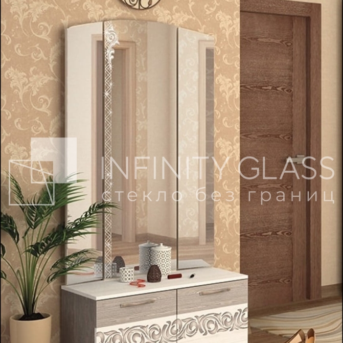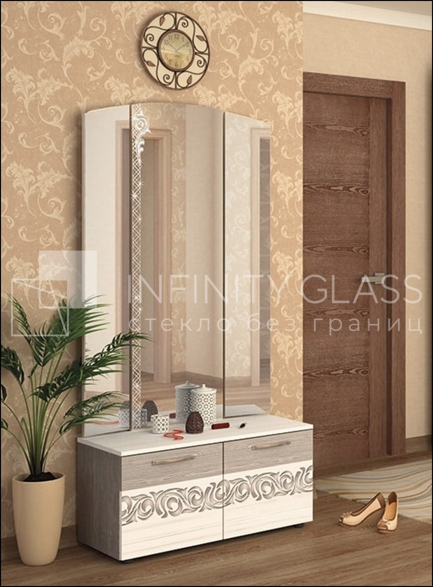 Компания «Инфинити Гласс» выполнила любопытный проект — трельяж с зеркалом в прихожую. Положенные этапы в рамках проекта проведены без задержек, изделие произведено на принадлежащем компании предприятии. Что было сделано: